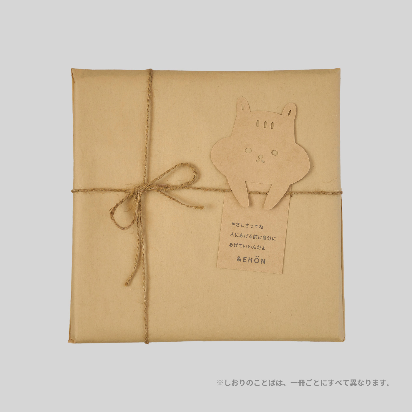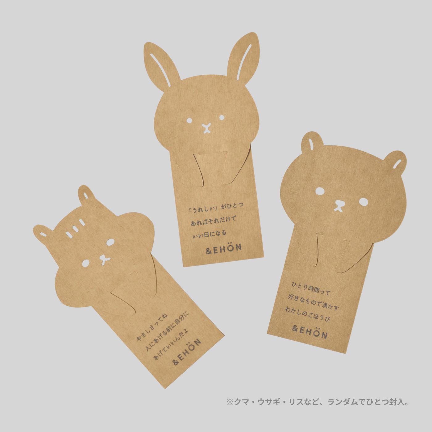 絵本には、クマ・ウサギ・リスなどいずれかの「ことばしおり」を、ランダムでひとつ封入しています。どんなことばが届くかは、開いてからのお楽しみです。